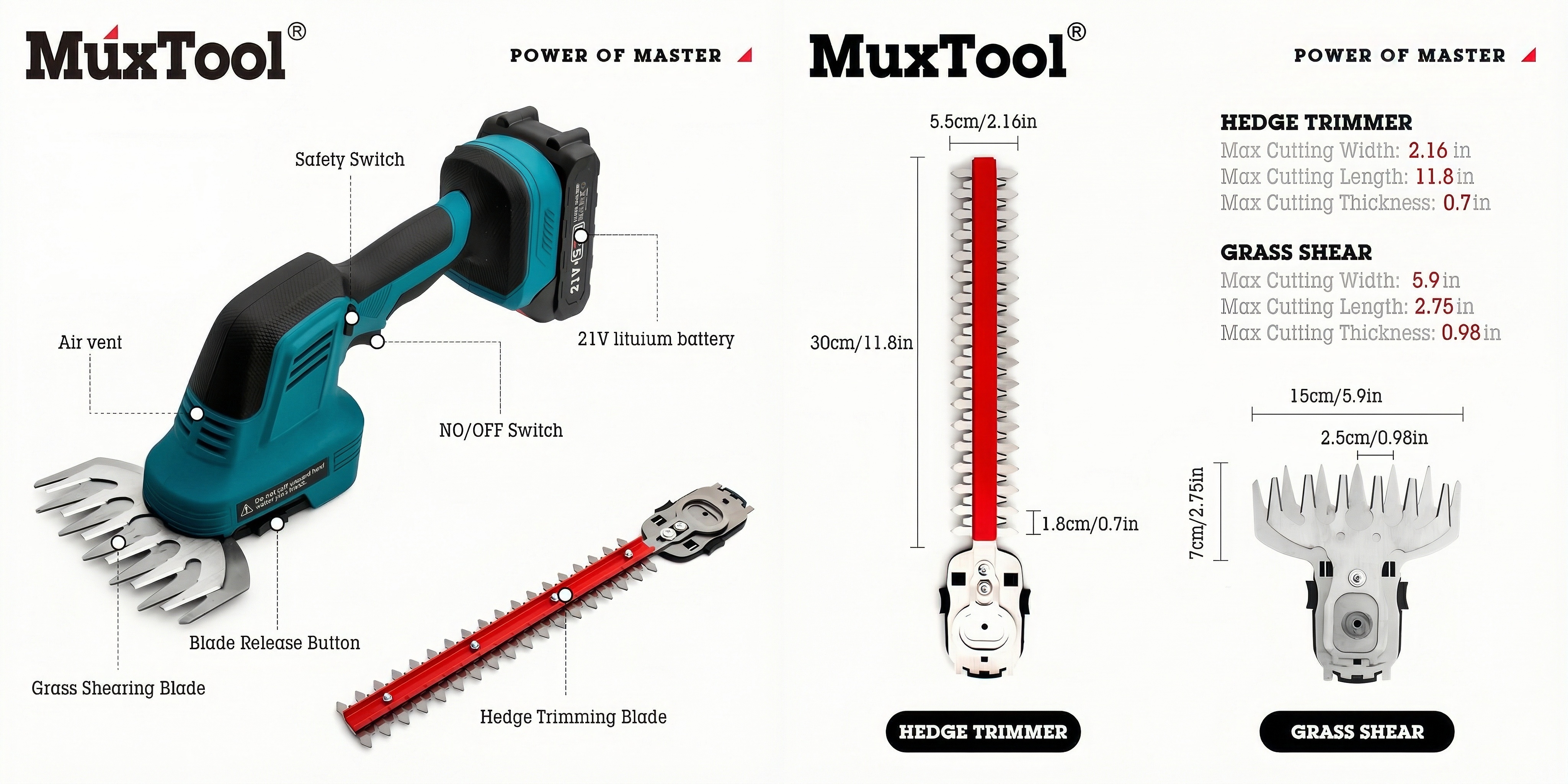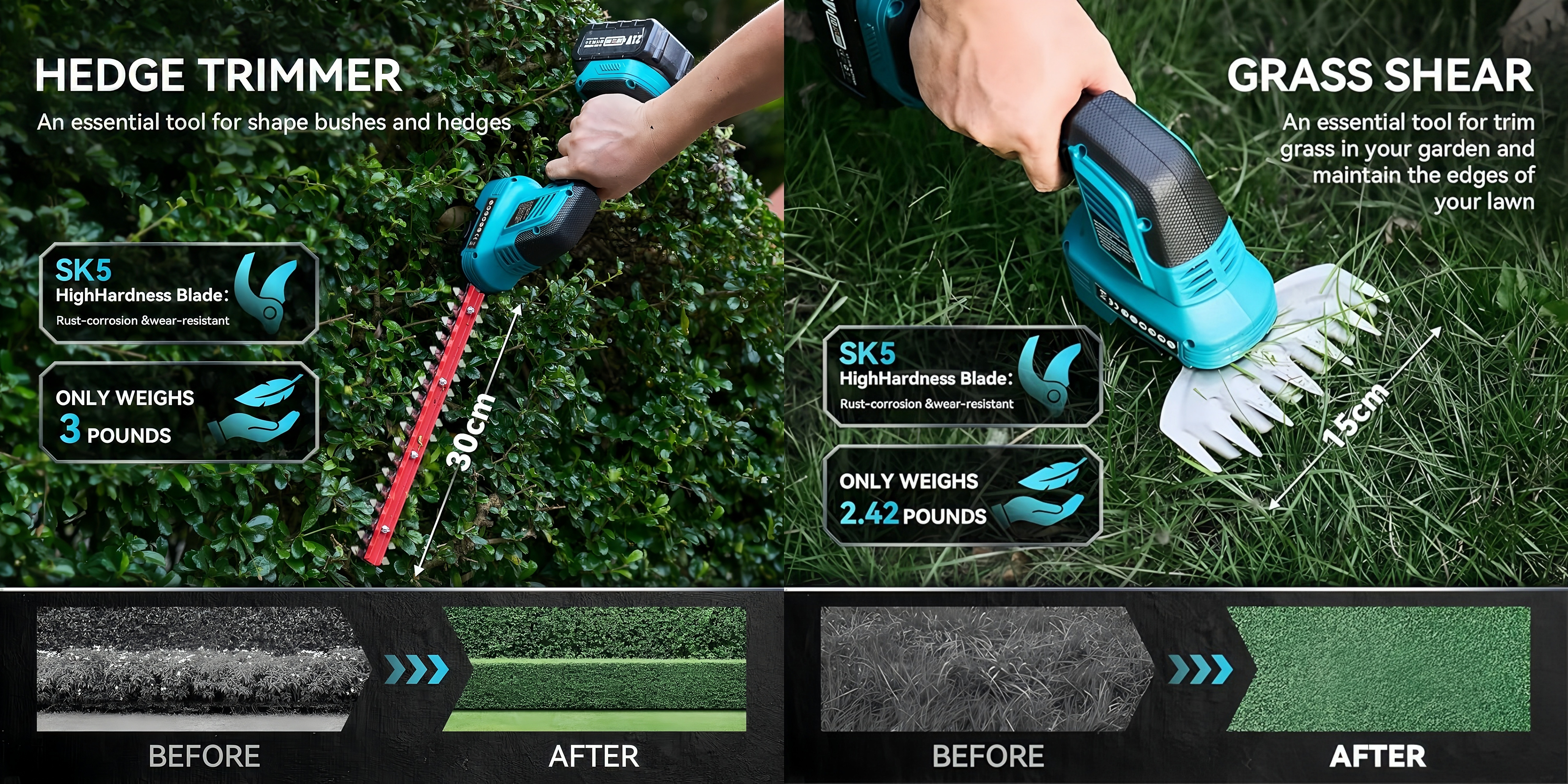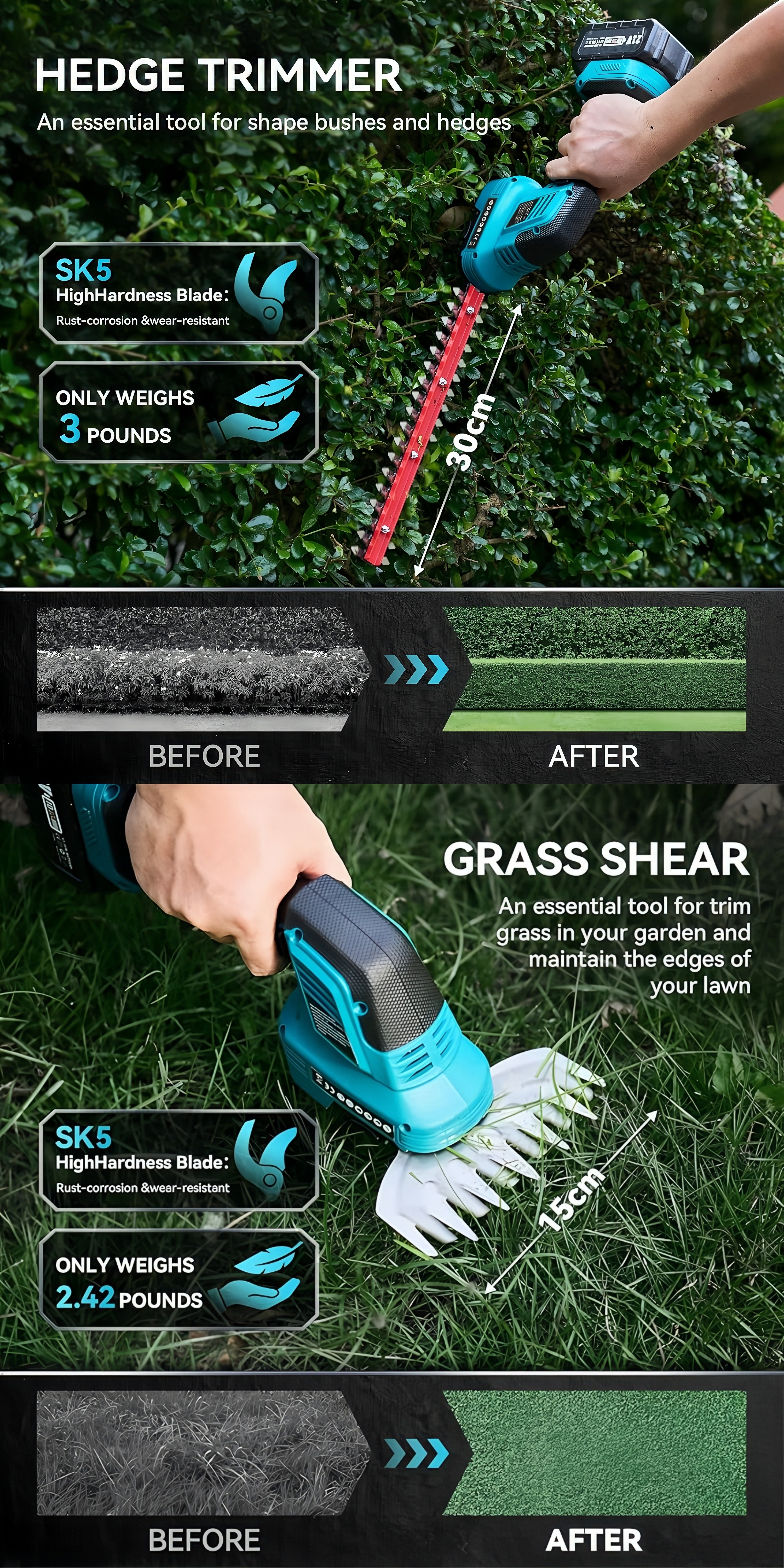 The short blade is specially designed for trimming lawns and smaller grassy areas, helping you easily cut grass edges that a lawn mower can’t reach.