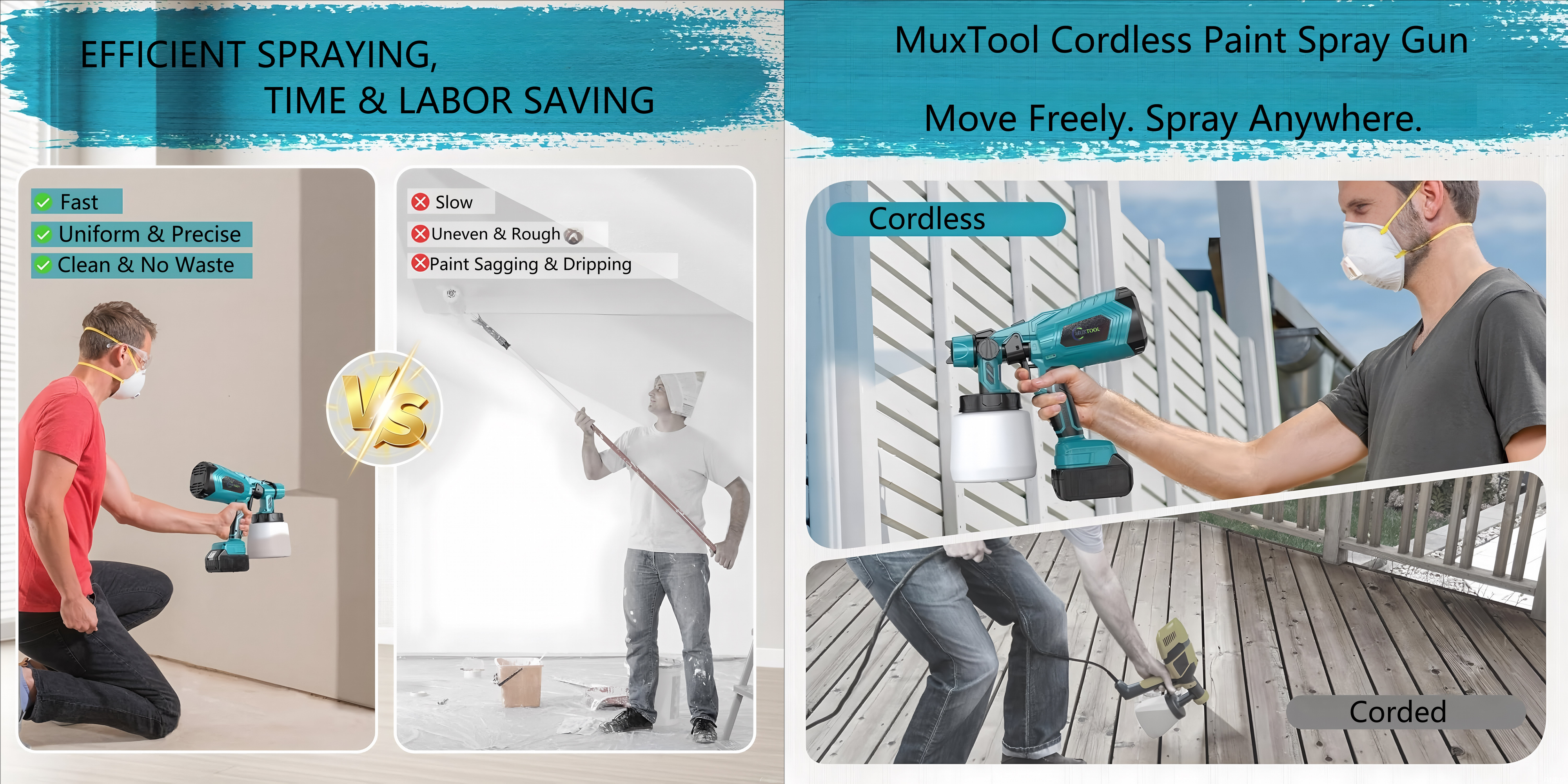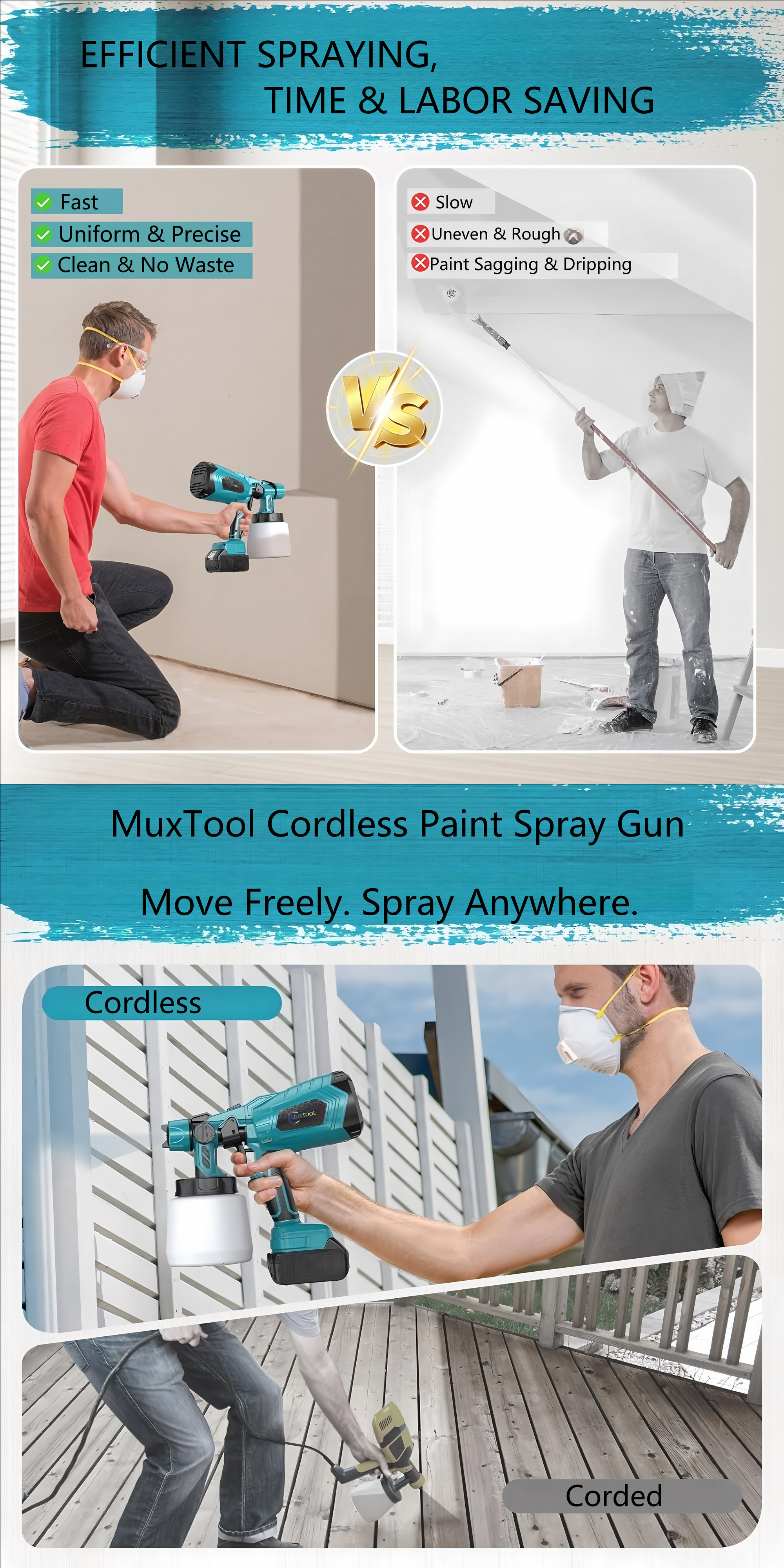 180° Horizontal Pattern: Covers large flat surfaces with ease, boosting your painting speed by up to 3×.